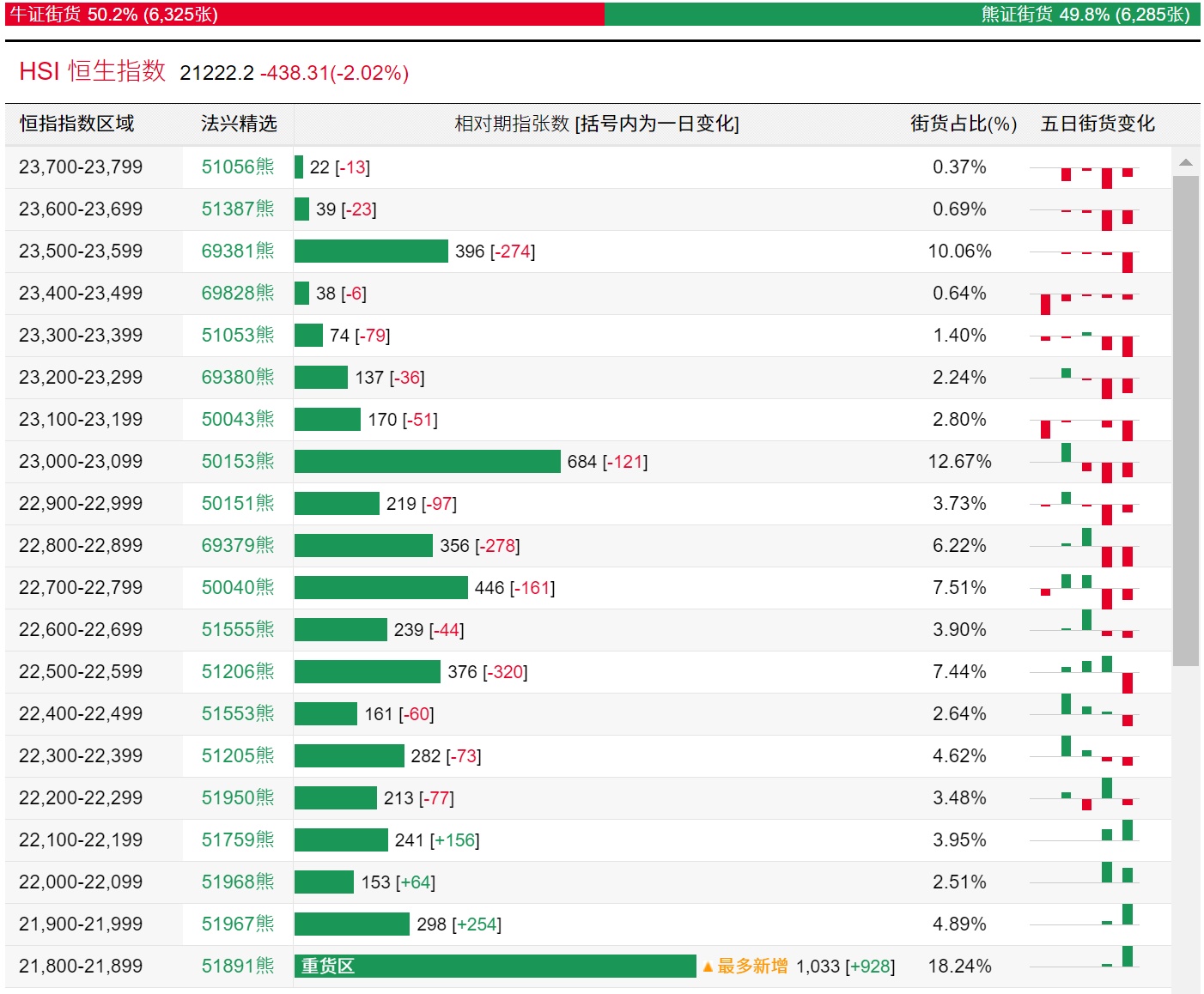 法兴恒指牛熊证街货分布图中的数据显示,熊证街货重货区和最多新增都在21800-21899区间,该区间最新熊证数量为1033张,较上一交易日增加928张。