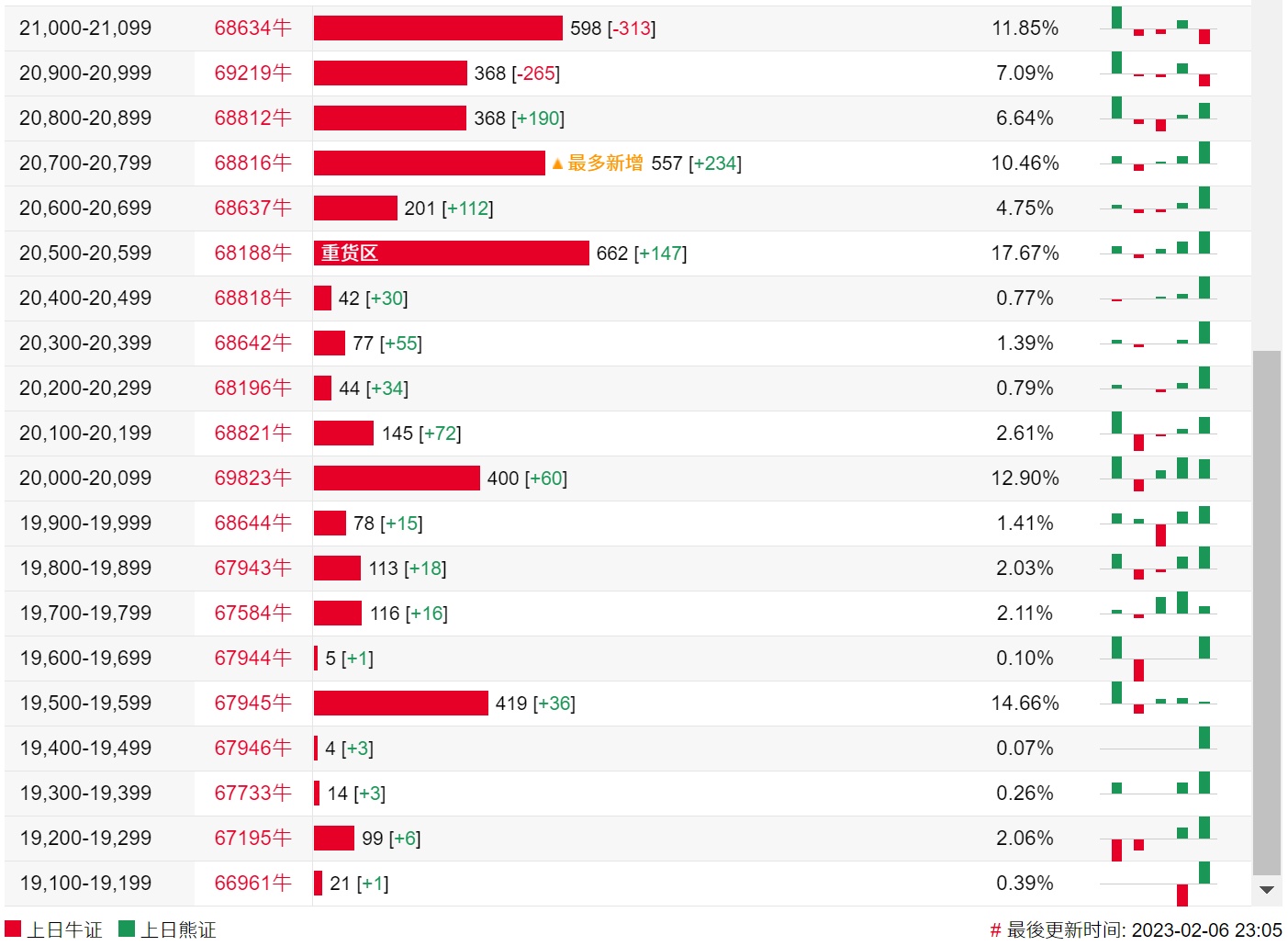 牛证街货重货区在20500-20599区间,该区间最新牛证数量为662张,较上一交易日增加147张;最多新增在20700-20799区间,该区间最新牛证数量为557张,较上一交易日增加234张。