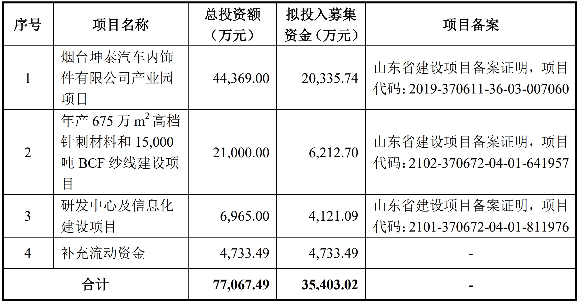 坤泰股份指出,此次募集资金扣除发行费用,将依次投资于以下项目: