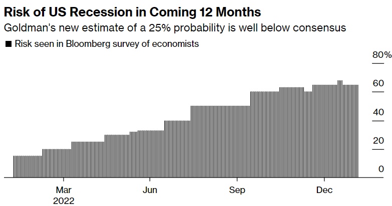 智通财经APP获悉,高盛经济学家表示,美国经济衰退的风险正在消退,就业市场持续强劲,有迹象显示商业信心有所改善。由Jan Hatzius领导的高盛团队将其对未来12个月美国经济衰退概率的估计从35%下调至25%。相比之下,媒体上月对经济学家的调查显示,未来12个月美国经济下滑的可能性为65%。从历史上看,任何12个月期间发生经济衰退的典型几率都在15%左右。