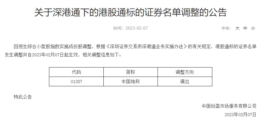 智通财经APP获悉,2月7日,深交所发布公告称,因恒生综合小型股指数实施成份股调整,根据《深圳证券交易所深港通业务实施办法》的有关规定,港股通标的证券名单发生调整并自2023年02月07日起生效,调出中国地利(01387)。