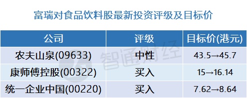 智通财经APP获悉,富瑞发布研究报告称,农夫山泉(09633)、康师傅控股(00322)及统一企业中国(00220)将于下月公布业绩,相信投资者会关注今年年初至今趋势、原材料价格前景及毛利率指引。随着中国防控政策优化,今年增长动力或会偏向饮料业务,即食面销售则恢复正常。该行认为,饮料业务为3间公司去年下半年主要销售增长动力,受惠于天气炎热及新产品推出,农夫山泉、康师傅及统一饮料业务预计增11%/8%/11%。