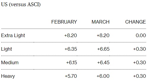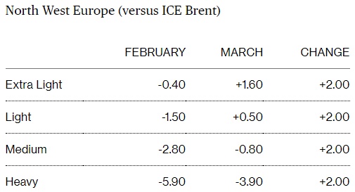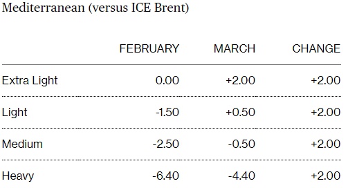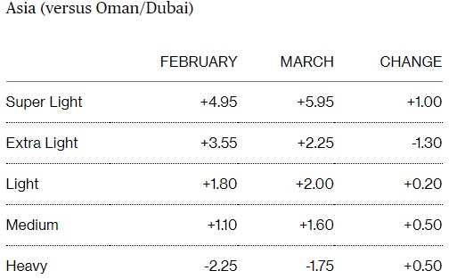 沙特阿美3月份针对全球地区的原油定价将为(美元/桶):