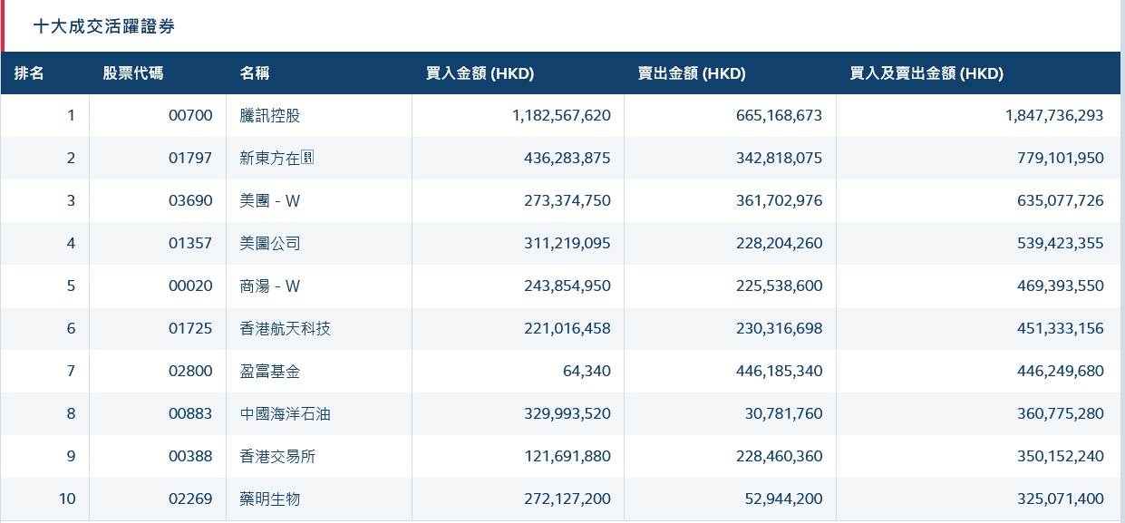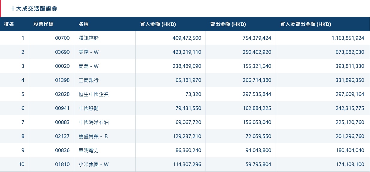 ETF方面,盈富基金(02800)、恒生中国企业(02828)分别遭净卖出4.46亿、2.97亿港元。此外,美图公司(01357)、腾盛博药-B(02137)分别获净买入8301万、5717万港元。而中国移动(00941)、华润电力(00836)分别遭净卖出8345万、768万港元。