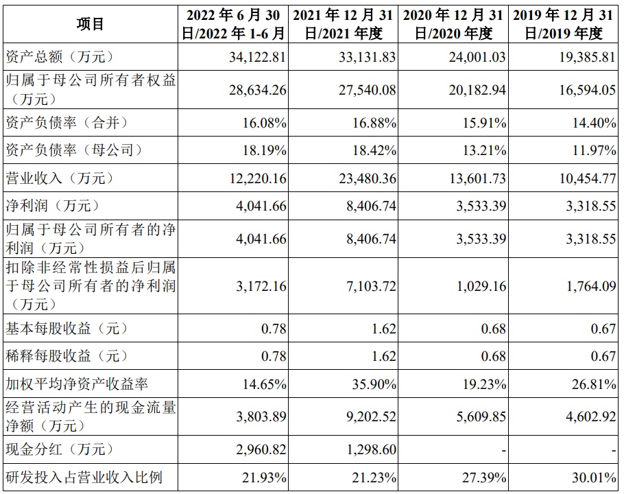 财务方面,2019年、2020年、2021年及2022年上半年,龙迅股份实现营收分别约为1.05亿元、1.36元、2.35亿元、1.22亿元人民币;同期,该公司净利润分别约为3318.55万元、3533.39万元、8406.74万元、4041.66万元人民币。