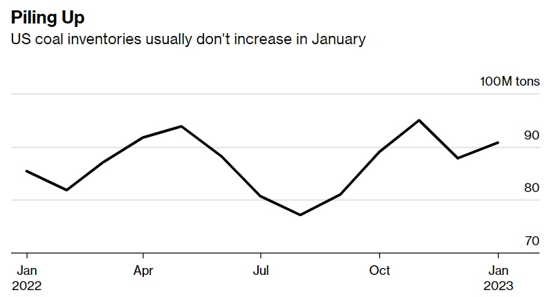 这种逆转来得很快。美国政府周二发布的数据显示,预计2023年美国公用事业的煤炭消费量将下降16%,这低于上个月预测的下降11%,部分原因是1月份天气温和。