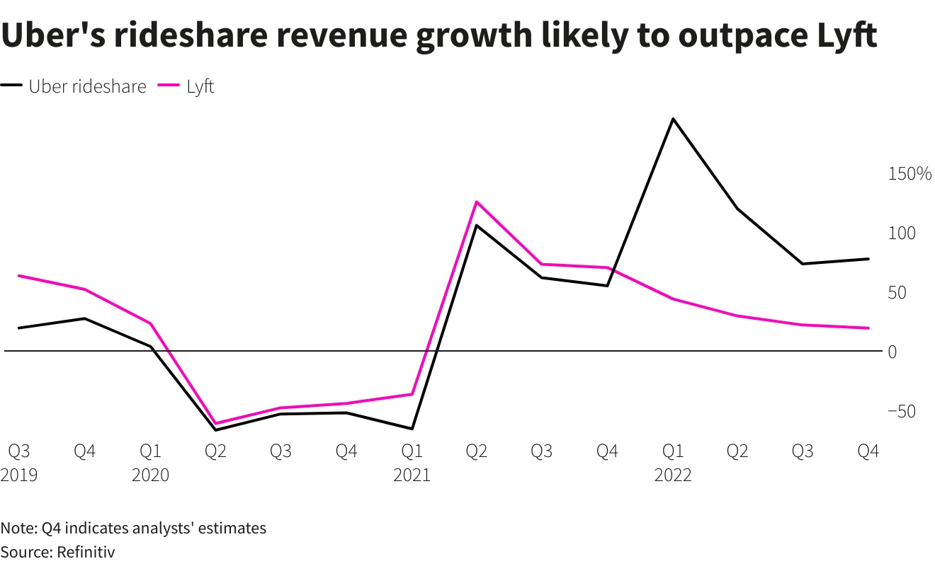 智通财经APP获悉,随着办公室重新开放、旅行复苏,拼车公司开始走出疫情低谷。分析师认为优步(UBER.US)第四季度的营收增长将超过竞争对手Lyft(LYFT.US),预计优步Q4的营收将同比增长47%;调整后的息税折旧及摊销前利润(EBITDA)为6.1479亿美元,调整后每股亏损0.18美元;预计Lyft Q4的营收同比增长19%;EBITDA或为9100万美元,同比增长22%,调整后每股收益为0.13美元。