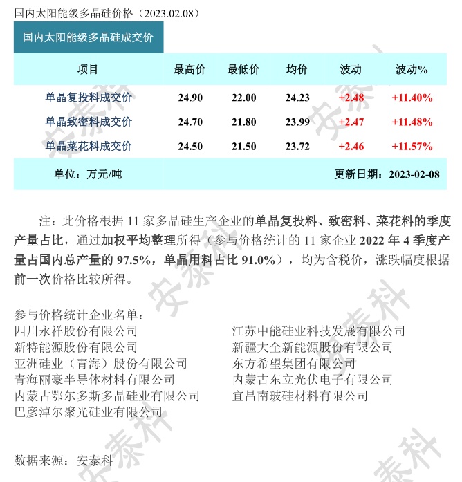 智通财经APP获悉,2月8日,硅业分会发布数据显示,本周国内单晶复投料价格区间在22.0-24.9万元/吨,成交均价为24.23万元/吨,周环比涨幅为11.40%;单晶致密料价格区间在21.8-24.7万元/吨,成交均价为23.99万元/吨,周环比涨幅为11.48%。