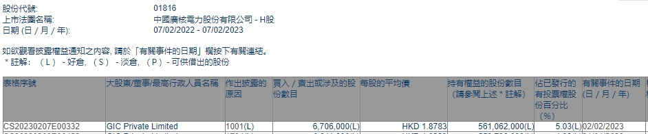 智通财经APP获悉,香港联交所最新资料显示,2月2日,GIC Private Limited增持中广核电力(01816)670.6万股,每股作价1.8783港元,总金额约为1259.59万港元。增持后最新持股数目为5.61亿股,最新持股比例为5.03%。