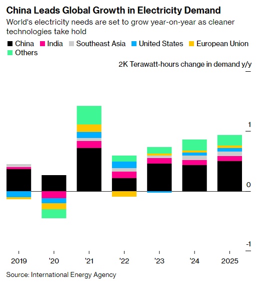 智通财经APP获悉,中国持续不断地需要更多电力来运行全球工厂,并为最大的电动汽车市场提供充电服务,表明中国对更多电力的迫切需求,这将把全球电力需求推到新的高度,加剧公用事业公司跟上步伐的压力。根据国际能源署(IEA)的年度电力报告,到2025年,全球每年新增的电力消耗将大致相当于英国和德国目前的用电量。预计届时中国将占全球电力需求的三分之一。