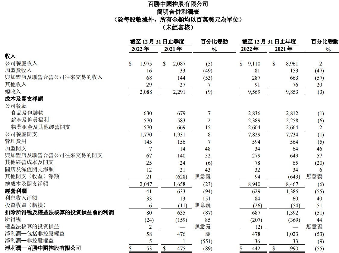 智通财经APP获悉,2月8日,百胜中国(09987)发布2022年第四季度及全年财务业绩报告。2022年全年,百胜中国实现营业收入95.7亿美元,同比下降3%;净利润4.42亿美元,较2021年同期的9.90亿美元下降55%。新店扩张方面,2022年四季度百胜中国净新增538家门店,2022年全年则净新增1159家门店。截至今日收盘,百胜中国(09987)收涨2%,报480港元;值得注意的是,自去年十月底以来,该股累计涨幅已接近50%。