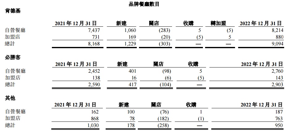 餐厅数目方面,截至2022年12月,百胜中国在全国拥有门店12947家,其中,肯德基有9094家门店,必胜客有2903家门店,其他品牌门店有950家门店。值得一提的是,百胜中国旗下除肯德基及必胜客之外的其他品牌门店数量在不断减少,2022年净减少量达80家。