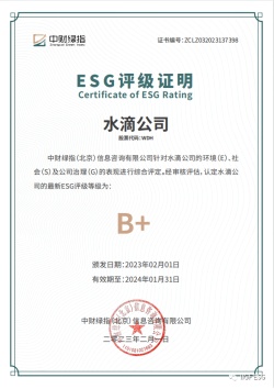 同时,根据专业ESG数据及评级公司秩鼎出具的2023年度Q1最新ESG评级成果,水滴公司ESG评级分数已上调至“BB”,处在行业中上等级。