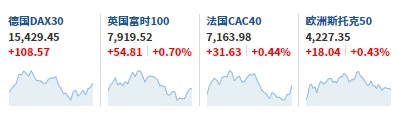 2. 截至发稿,德国DAX指数涨0.70%,英国富时100指数涨0.70%,法国CAC40指数涨0.44%,欧洲斯托克50指数涨0.43%。