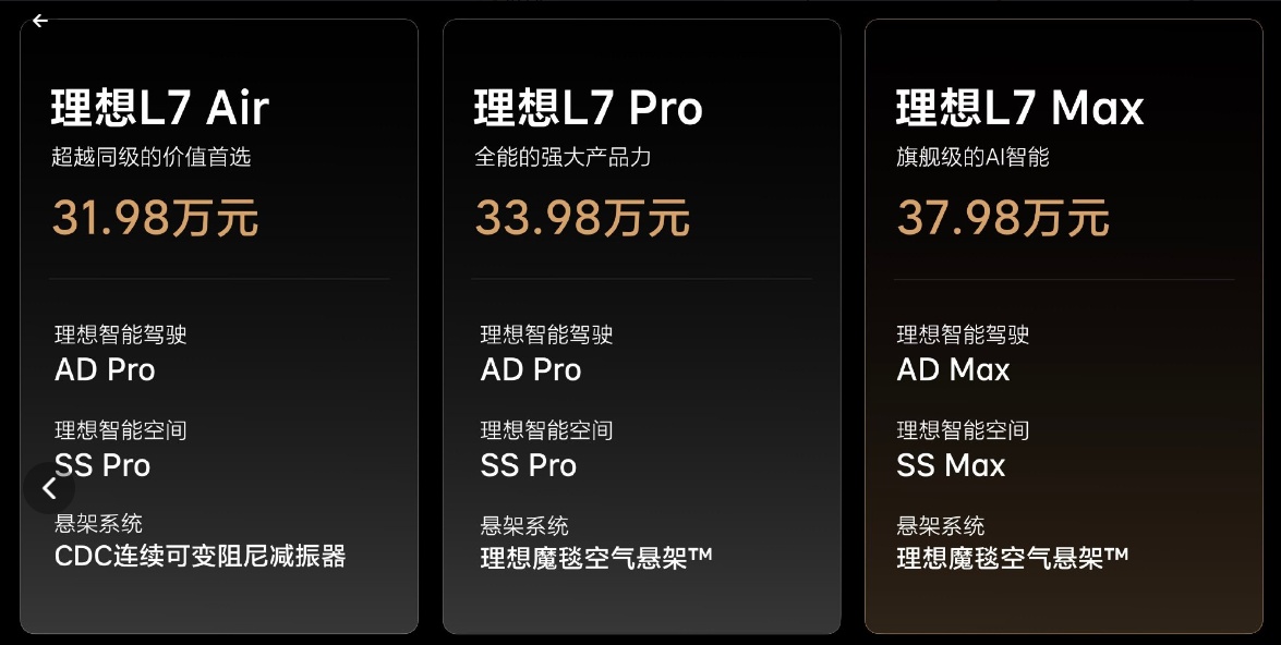 智通财经APP获悉,理想汽车(02015)官微2月8日消息,理想L7正式上市。理想L7 Air全国统一零售价31.98万元,理想L7 Pro和Max全国统一零售价分别为33.98万元和37.98万元。官微表示,理想L7 Pro 和Max 将在3月1日陆续开启交付,理想L7 Air 将在4月初陆续开启交付。理想还将同步推出理想L8 Air,售价为33.98万元,理想L8 Air 也将在4月初陆续开启交付。理想L7全系车型和理想L8 Air 即将在理想汽车App和官网开启正式定购。明天起,消费者可以在理想汽车全国各地的零售中心体验和试驾全新的理想L7。