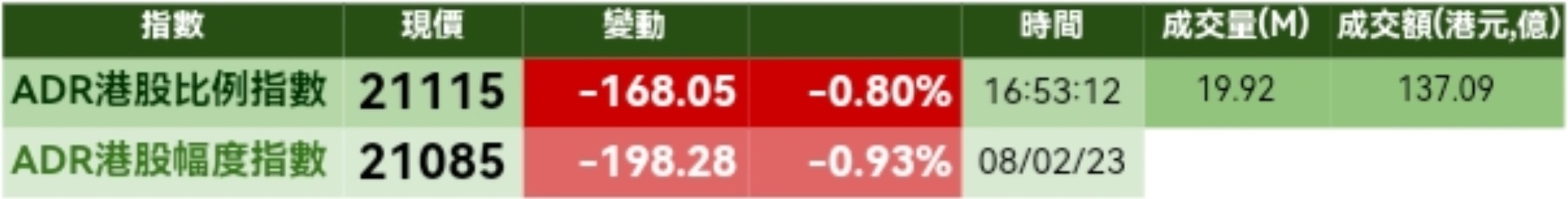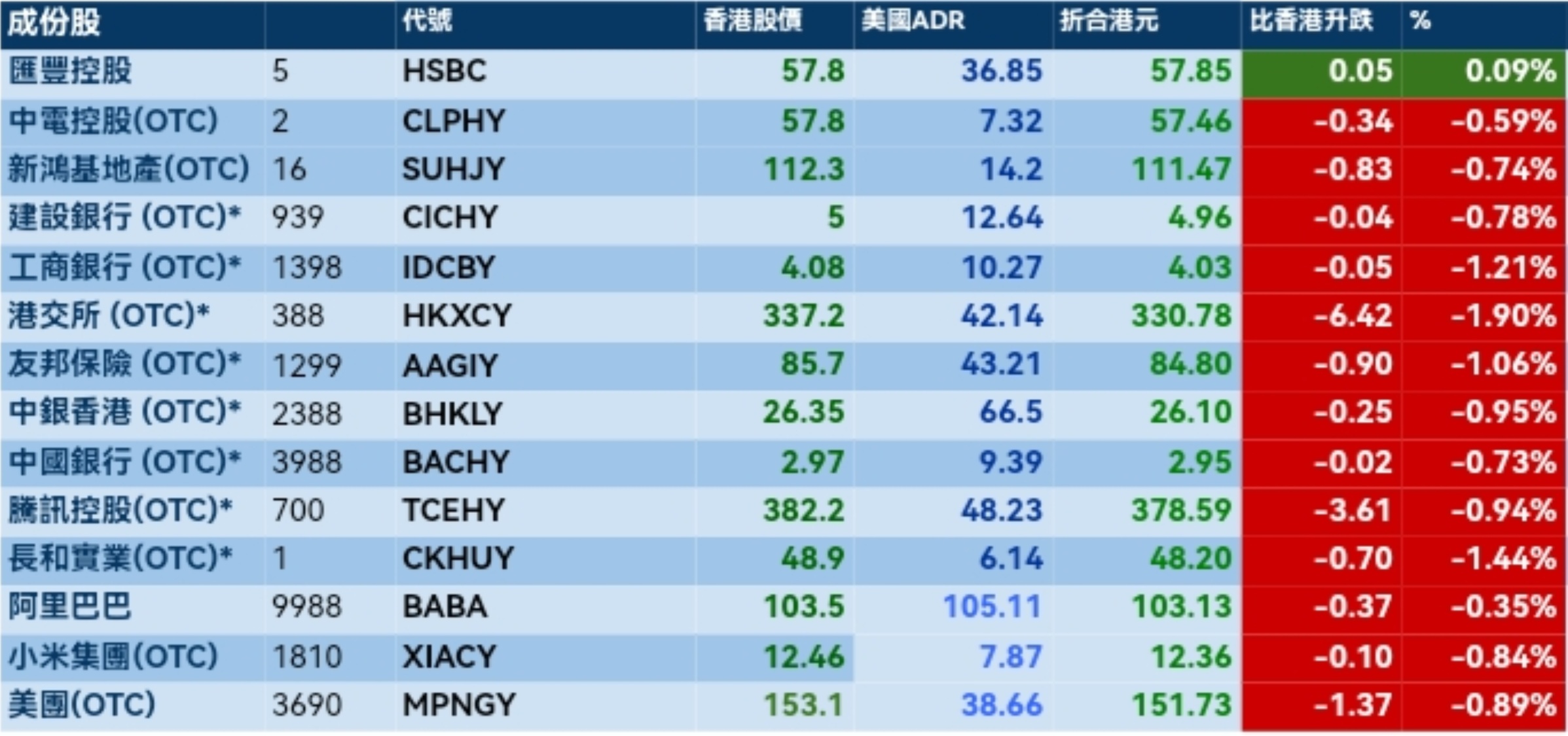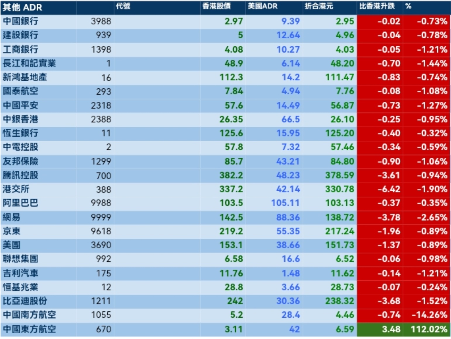 智通财经APP获悉,周三美股三大指数集体收跌,港股ADR指数下跌,按比例计算,收报21115点,较香港收市跌168.05点或0.80%。