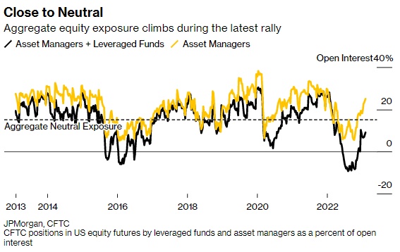 这一仓位调整已使众多投资者从减持转为持有接近过去10年平均水平的股票。摩根大通和德意志银行的数据显示,与去年第二季度美联储开始加息以来相比,投资者目前的仓位最接近中性。