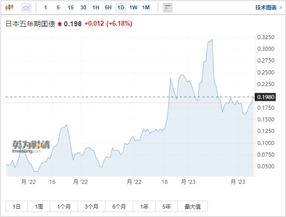 智通财经APP获悉,周四,日本5年期国债收益率升至两周以来的最高点,1月底时这一水平促使日本央行提供了相同期限的贷款,以遏制通胀。截至发稿,日本5年期国债收益率上升6.18%,至0.198%,为1月27日日本央行宣布向金融机构提供5年期抵押贷款以来的最高水平。