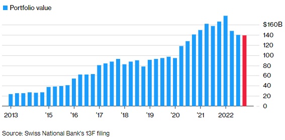 智通财经APP获悉,去年,全球股市动荡使瑞士央行的美国股票投资组合损失了268亿美元。根据提交给美国证券交易委员会的所谓13F文件计算,该组合的价值在2022年下降了16%,截至12月31日为1393亿美元。报告显示,瑞士央行持有2678家美国上市公司的股票。