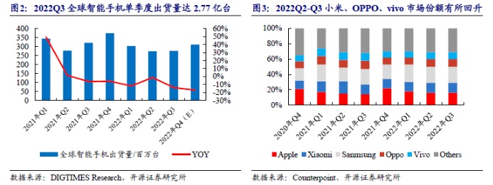 以智能手机为例,2022Q3开始,全球智能手机出货量持续回升,单季度达到2.77亿台,环比增长0.88%,2022Q4出货量则升至3.11亿台。国内方面,市场数据亦指向2022年5月以来出货量已经呈现从低谷反弹的态势,未来市场情况预计将有所好转。