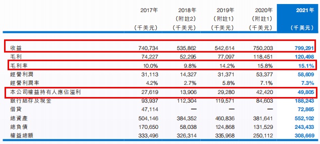 业绩来看,2017-2021年期间,高伟电子的收入分别为7.41亿美元、5.36亿美元、5.43亿美元、7.5亿美元、7.99亿美元,呈现一定波动性但近年来仍处于稳步扩张的趋势之中。