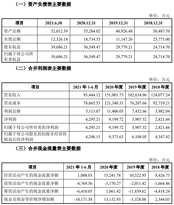 财务方面,2018年、2019年、2020年及2021年1-6月,公司分别实现营收约为12.41亿元、10.26亿元、15.10亿元及9.34亿元;同期,净利润分别为2821.66万元、5907.52万元、9199.72万元、4295.21万元。