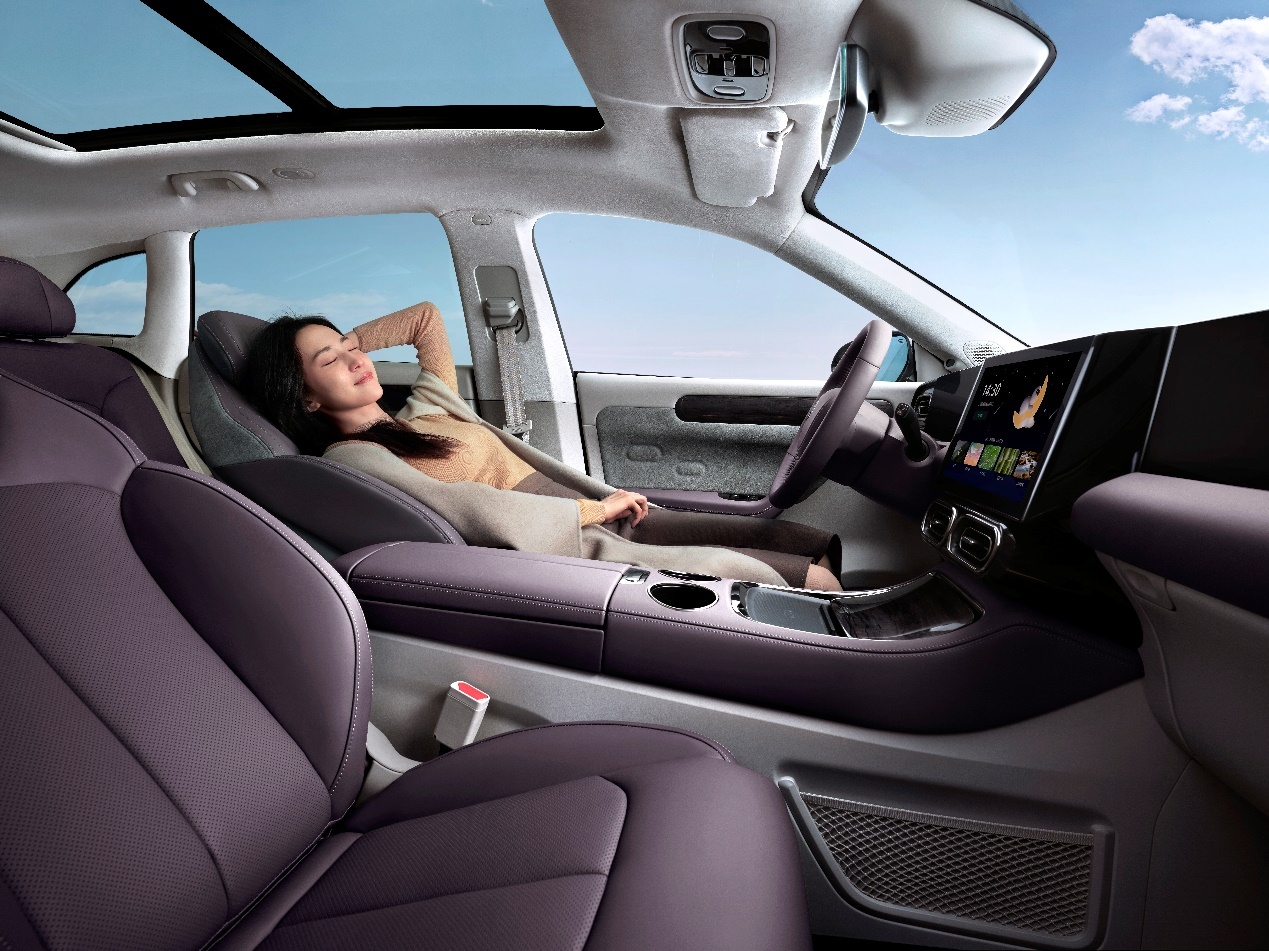 内饰采用双色设计,座椅、方向盘大面积使用Nappa真皮,辅以四门1600W无极变色透光氛围灯;6D人体工程学座椅与人体贴合紧密,前排座椅可具备通风/加热、SPA级智能按摩功能,主驾多达10向电动调节,提供尊享舒适的坐乘体验;另外,全系标配14932c㎡ 全景星空顶,更可选配面积11400cm2全景可开启天窗,体验不受束缚的自由舒展空间;搭载阿嘉米斯沉浸式音乐座舱,可拥有最多12个高性能扬声器及6种音效,让用户享受愉悦的听觉盛宴;后排综合多媒体控制屏支持触控调节,让后排乘员便利操作风量、空调温度、音乐切换、音量和后排座椅加热。