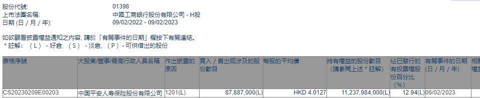智通财经APP获悉,香港联交所最新资料显示,2月6日,平安人寿减持工商银行(01398)8788.7万股,每股作价4.0127港元,总金额约为3.53亿港元。减持后最新持股数目约为112.38亿股,最新持股比例为12.94%。