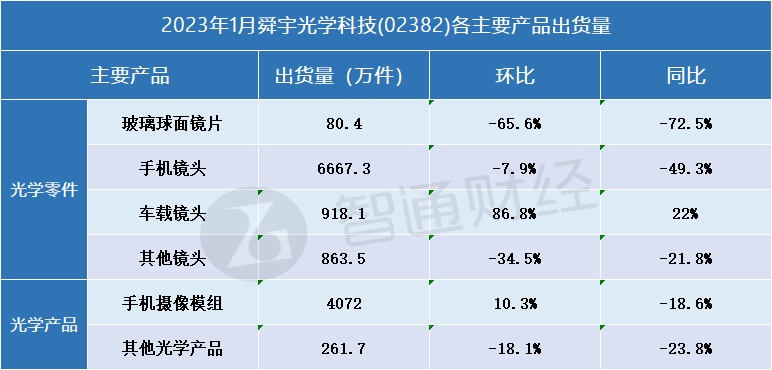 智通财经APP获悉,2月9日,舜宇光学科技(02382)发布2023年1月各主要产品出货量,其中,手机镜头出货量6667.3万件,环比减少7.9%,同比减少49.3%。对此,舜宇光学科技解释称,主要是因为去年同期出货量基数较高且现时整体智能手机市场需求仍然疲软。此外,据公告,除车载镜头出货量同比增加22%外,玻璃球面镜片及其他镜头、手机摄像模组及其他光学产品的出货量同比均有不同程度的下降。
