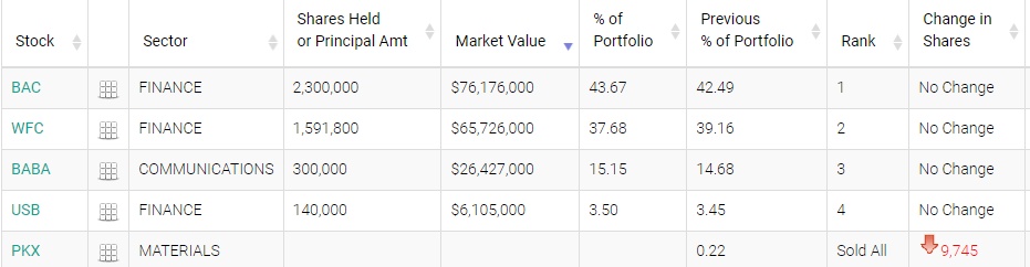 富国银行(WFC.US)位列第二,整体持仓约159.18万股,持仓市值约6573万美元,占投资组合比例由39.16%小幅降至37.68%。