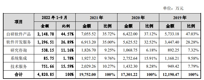 从主要产品和服务,清大科越的主要产品和服务包括自研软件产品、软件开发服务、研究咨询、系统集成和技术服务。其主营业务收入按业务类型划分的具体构成情况如下所示: