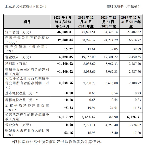 财务方面,2019年、2020年、2021年、2022年1-9月,清大科越实现营收分别约为1.25亿元、1.73亿元、1.98亿元、4820.85万元,同一时期,该公司净利润分别约为2787.7万元、5967.33万元、8035.69万元、-1440.02万元。