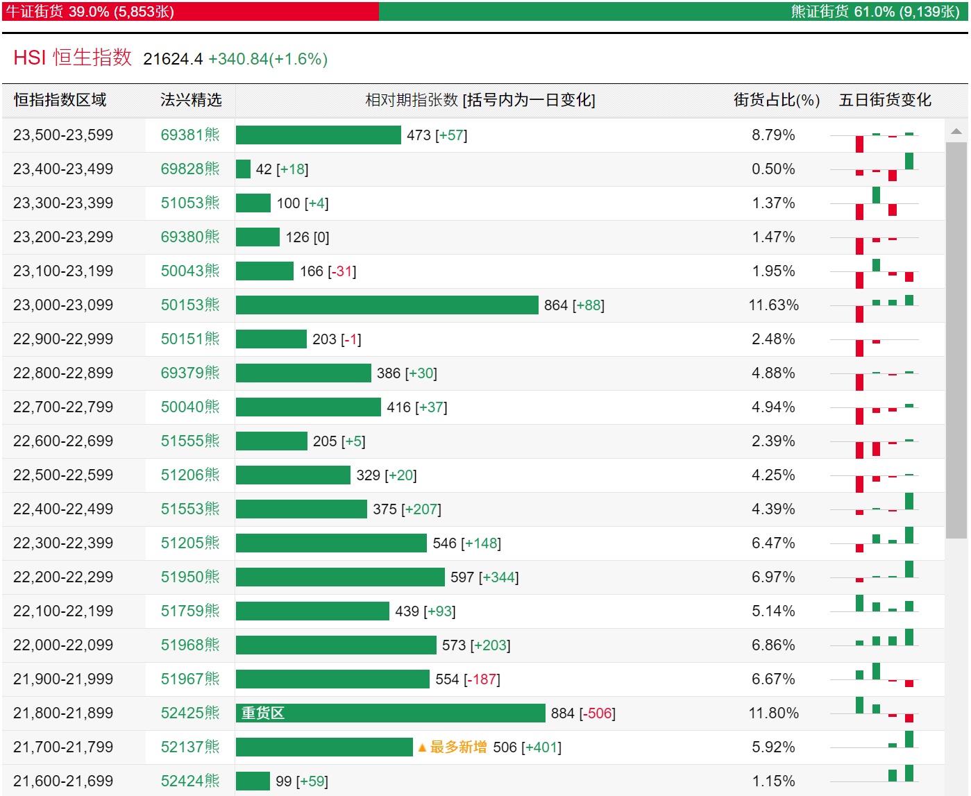 法兴恒指牛熊证街货分布图中的数据显示,熊证街货重货区在21800-21899区间,该区间最新熊证数量为884张,较上一交易日减少506张;最多新增在21700-21799区间,该区间最新熊证数量为506张,较上一交易日增加401张。