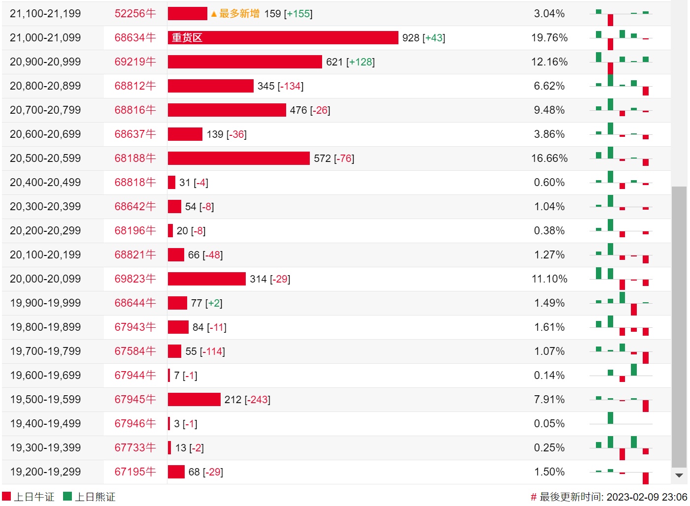 牛证街货重货区在21000-21099区间,该区间最新牛证数量为928张,较上一交易日增加43张;最多新增在21100-21199区间,该区间最新牛证数量为159张,较上一交易日增加155张。