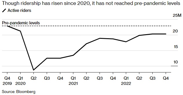 截至四季度末的活跃乘客为2035.8万人,同比增长8.7%,但仍低于2019年底的2290万;每活跃乘客的营收为57.72美元,同比增长11.5%。