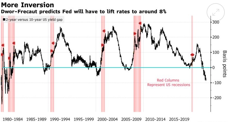 Dwor-Frecaut表示:"如果我对通胀和美联储政策利率的判断是正确的,这将对市场造成巨大冲击 。因此,我看到了更深层次倒挂的可能。2年期美国国债收益率将大幅走高。超过6%很容易。”