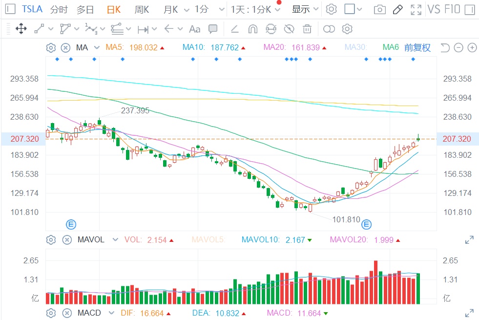 智通财经APP获悉,由于投资者对经济前景的乐观情绪以及押注美联储激进加息周期即将结束,特斯拉(TSLA.US)在进入2023年之后强势反弹。数据显示,2023年迄今为止,特斯拉股价上涨了超68%;在1月6日跌至101.81美元的盘中低点后,该股股价自那以来的涨幅超过100%。