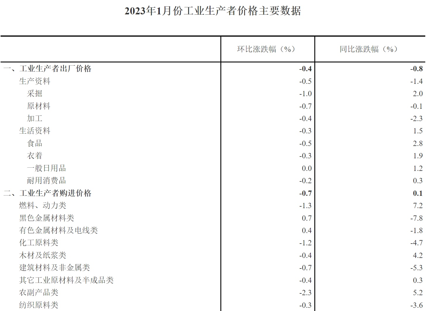 2023年1月份工业生产者出厂价格同比下降0.8% 环比下降0.4%