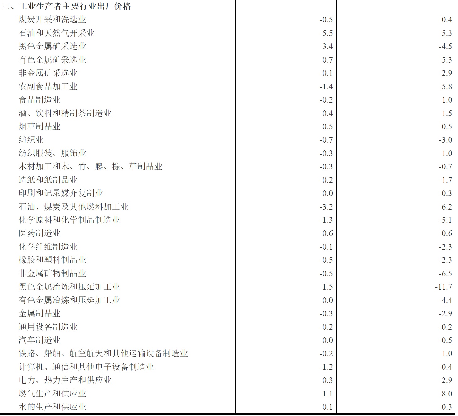 工业生产者购进价格中,农副产品类价格下降2.3%,燃料动力类价格下降1.3%,化工原料类价格下降1.2%,建筑材料及非金属类价格下降0.7%;黑色金属材料类价格上涨0.7%,有色金属材料及电线类价格上涨0.4%。