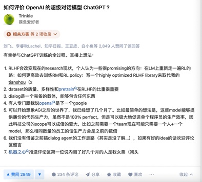 知乎答主“Trinkle”是推出ChatGPT的美国人工智能实验室OpenAI员工,他参与了ChatGPT训练的全过程。在问题“如何评价 OpenAI 的超级对话模型 ChatGPT ?”下“Trinkle”写道,大家可以开始想象AGI之后的世界了。