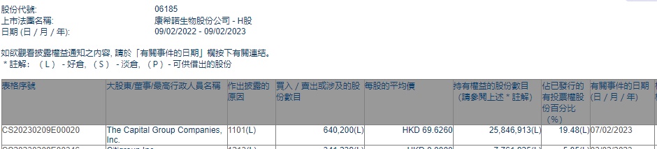 智通财经APP获悉,香港联交所最新资料显示,2月7日,美国资本集团增持康希诺生物(06185)64.02万股,每股作价69.6260港元,总金额约为4457.46万港元。增持后最新持股数目约为2584.69万股,最新持股比例为19.48%。