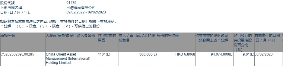 智通财经APP获悉,香港联交所最新资料显示,2月8日,China Orient Asset Management (International) Holding Limited增持日清食品(01475)30万股,每股作价6.8068港元,总金额为204.204万港元。增持后最新持股数目为9407.4万股,最新持股比例为9.01%。