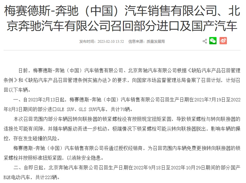 智通财经APP获悉,国家市场监督管理局2月10日消息,自2023年2月13日起,梅赛德斯-奔驰汽车销售有限公司召回生产日期在2021年7月19日至2022年8月3日期间的部分进口GLE SUV、GLS SUV汽车,共计70辆。本次召回范围内部分车辆因转向联接器的锁紧螺栓没有按照规定扭矩紧固,导致锁紧螺栓与转向联接器的连接处可能有间隙,并随车辆振动而进一步松动。极端情况下锁紧螺栓可能从转向联接器脱出,影响车辆的操控,存在发生碰撞的风险。