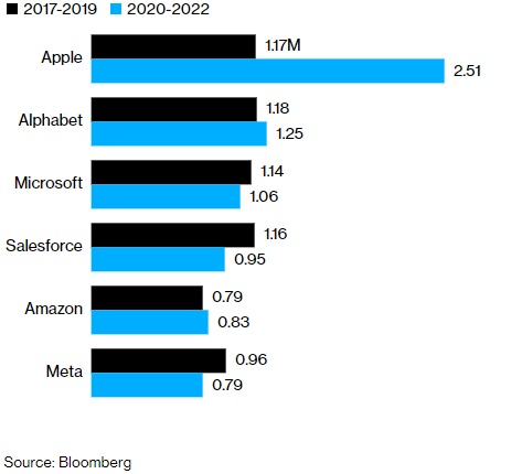 在疫情流行期间,苹果每增加一名员工所产生的收入也比前三年要多许多。这与其大多数科技公司同行的运营情况形成鲜明对比。