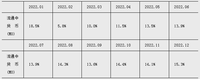 注4:自2022年12月起,“流通中货币(M0)”含流通中数字人民币。12月末流通中数字人民币余额为136.1亿元。修订后,2022年各月末M1、M2增速无明显变化。修订后M0增速如下: