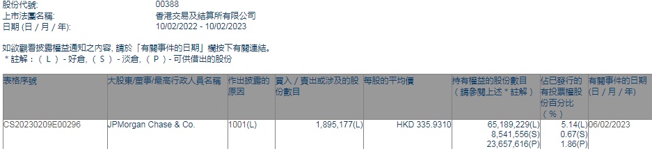 智通财经APP获悉,香港联交所最新资料显示,2月6日,小摩增持香港交易所(00388)189.5177万股,每股作价335.931港元,总金额约为6.366亿港元。增持后最新持股数目约为6518.92万股,最新持股比例为5.14%。
