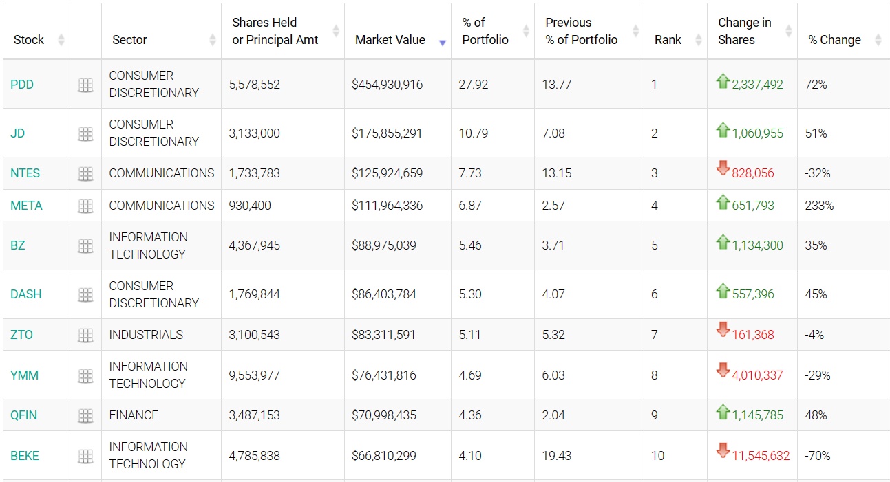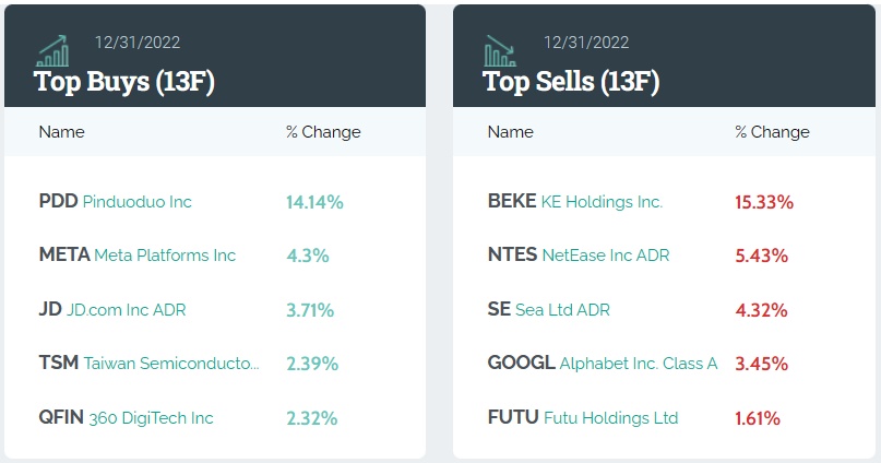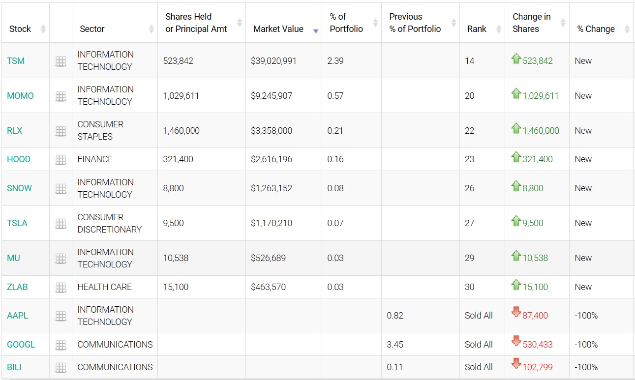 从持仓比例变化来看,前五大买入标的分别是:拼多多(PDD.US)、Meta Platforms(META.US)、京东(JD.US)、台积电(TSM.US)以及360数科(QFIN.US)。