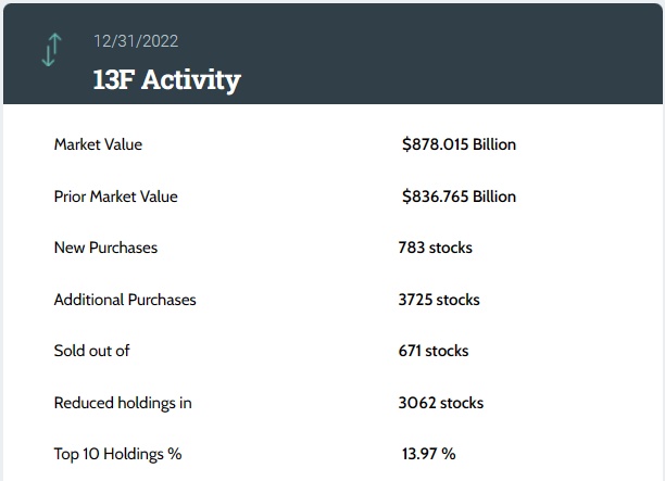 据统计,美银第四季度持仓总市值约8780.15亿美元,上一季度总市值为8367.65亿美元,环比增长约5%。美银在四季度的投资组合中新增了783只个股,增持了3725只个股,减持了3062只个股,清仓了671只个股。其中前十大持仓标的占总市值的13.97%。
