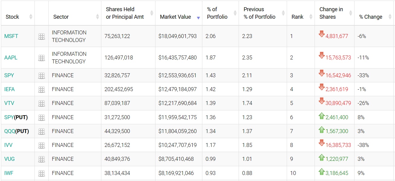 SPDR标普500指数ETF(SPY.US)位列第三,持仓约3282.7万股,持仓市值约125.5亿美元,占投资组合比例为1.43%,较上季度持仓数量下降33%。
