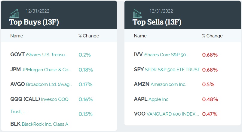 前五大卖出标的分别是:iShares标普500指数ETF(IVV.US)、SPDR标普500指数ETF(SPY.US)、亚马逊(AMZN.US)、苹果(AAPL.US)、Vanguard标普500指数ETF(VOO.US)。